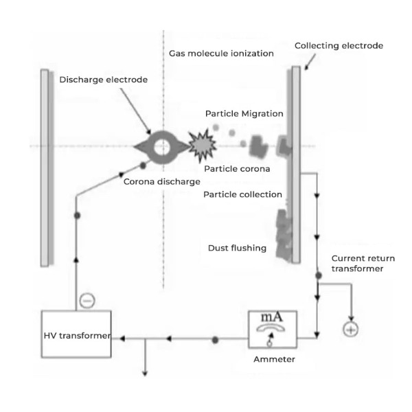 یونیزاسیون ذرات: همانطور که گاز دودکش یا هوای خروجی وارد رسوب کننده می شود، الکترود تخلیه یک میدان الکتریکی با ولتاژ بالا ایجاد می کند. این میدان ذرات معلق را یونیزه می کند و به آنها بار منفی می دهد.